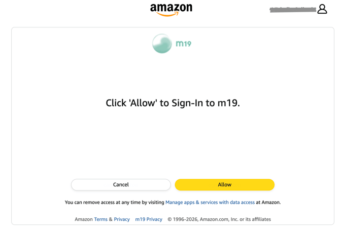 - Click on "Allow" to grant m19 permission to access your list of linked Amazon accounts associated with your email.