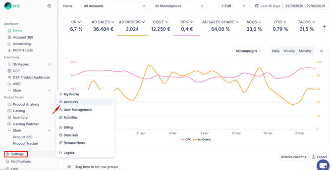 - Navigate to the Settings section and select 'Accounts'