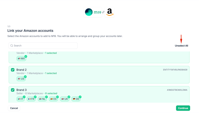 You will see a list of the accounts you have access to. By default, all accounts are selected. If you don’t want to grant access to all of them, simply deselect the accounts you wish to exclude and select only the ones you want to connect to m19, then click on "continue".