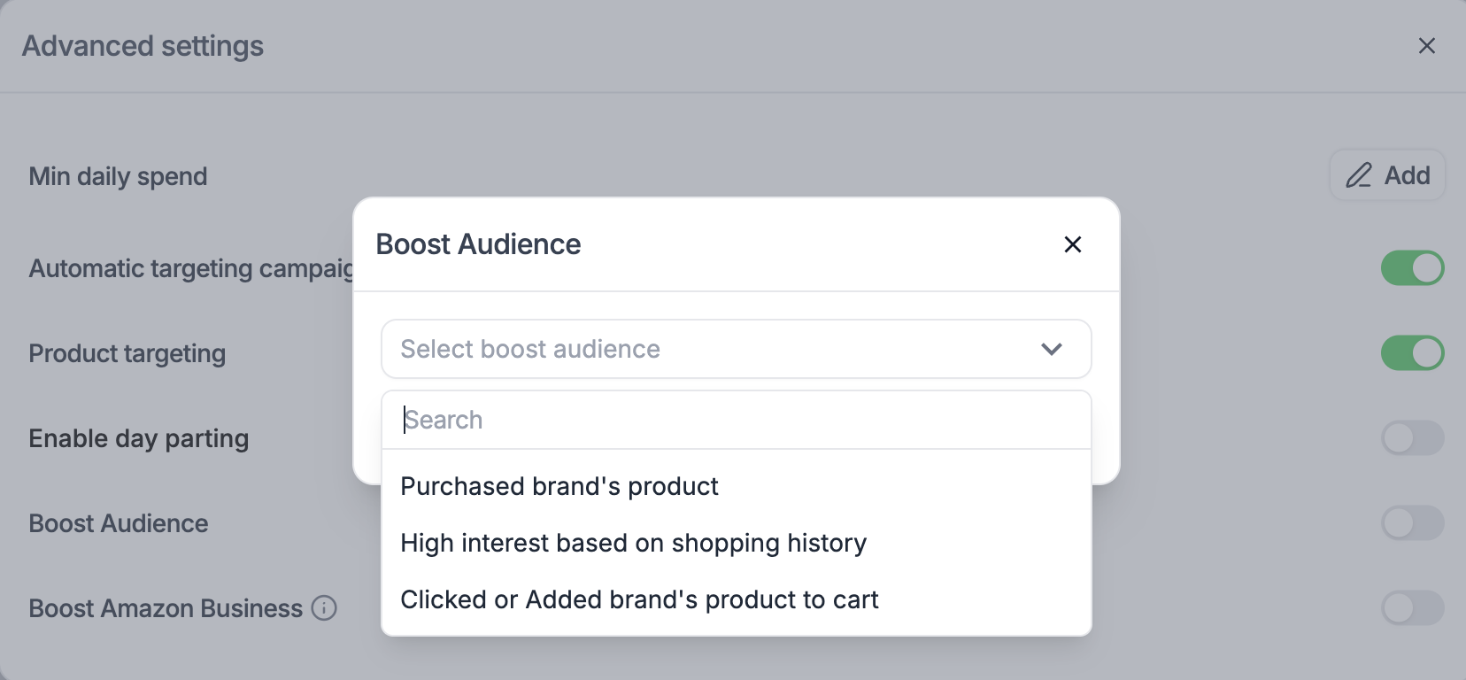 When you enable Audience Boost, you are telling the m19 algorithm to aggressively target a specific group of shoppers. The tool applies a bid modifier, essentially increasing the bid amount when a user from the selected audience searches for your keywords. This increases the likelihood of your ad being shown to these high-value prospects.