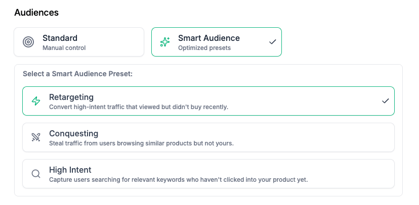 Can I edit the rules of a Smart Audience? Smart Audiences are locked to ensure the logic remains optimized. If you need to create a custom structure (e.g., changing the lookback window from 30 days to 60 days), please use the Standard mode and build custom audiences.